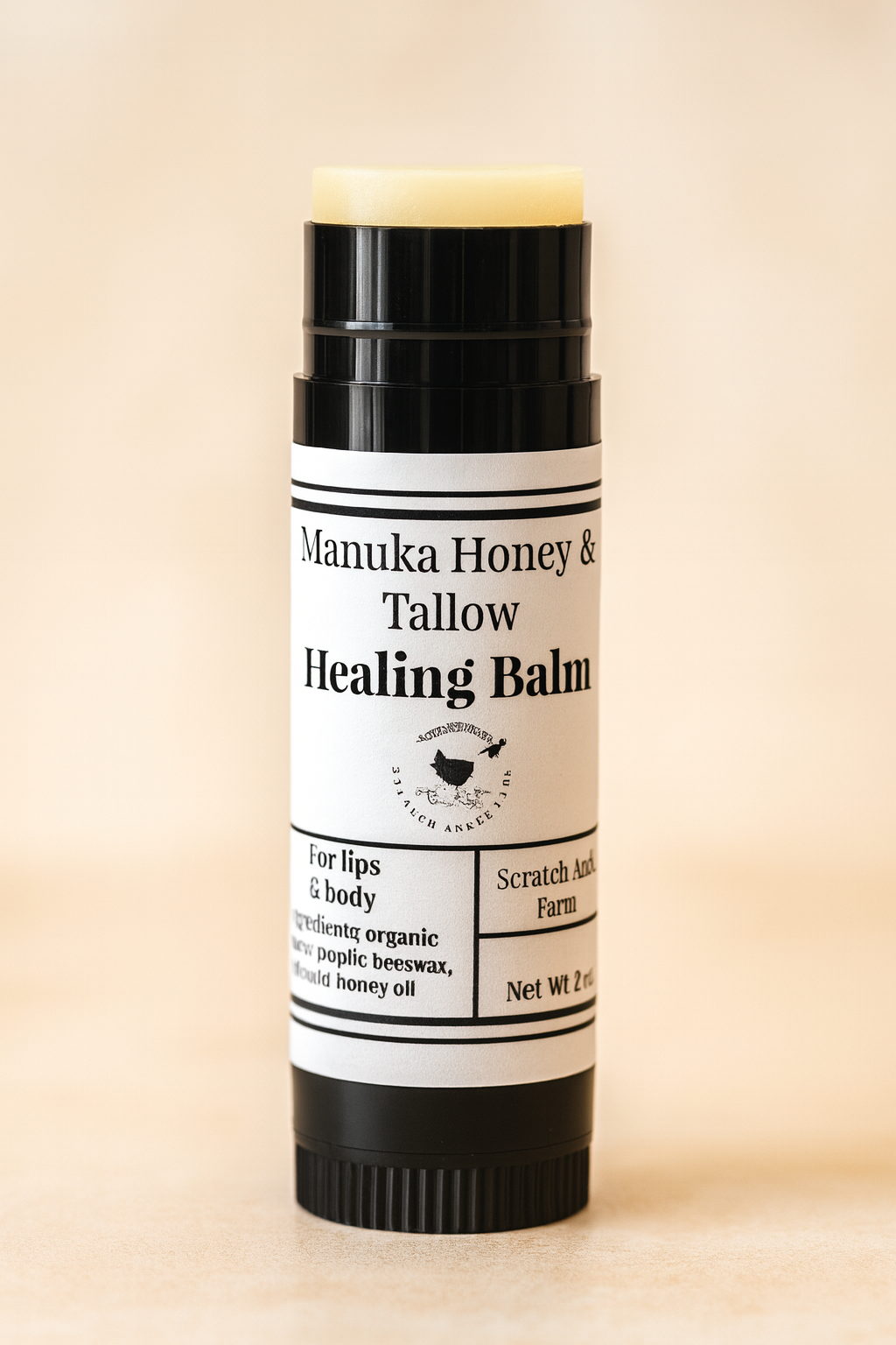 Introducing our luxurious Manuka Honey Healing Balm, a nourishing blend crafted to soothe and rejuvenate your skin. This balm combines the unique healing properties of Manuka honey, renowned for its antibacterial and anti-inflammatory benefits, with the richness of tallow to provide deep hydration and support skin repair.